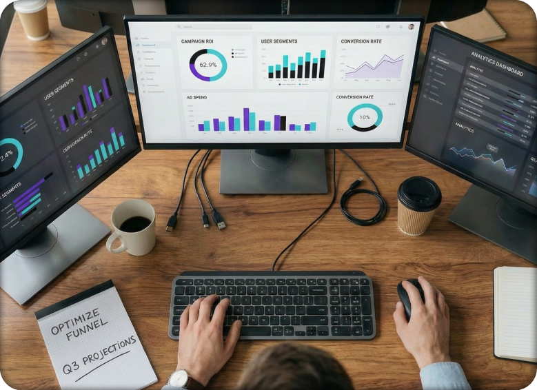 We bring structure to marketing operations through planning, prioritisation, and performance tracking. We help leaders see what is working, what is not, and where effort should be focused next. This service supports better decision-making by turning activity into insight and insight into action.